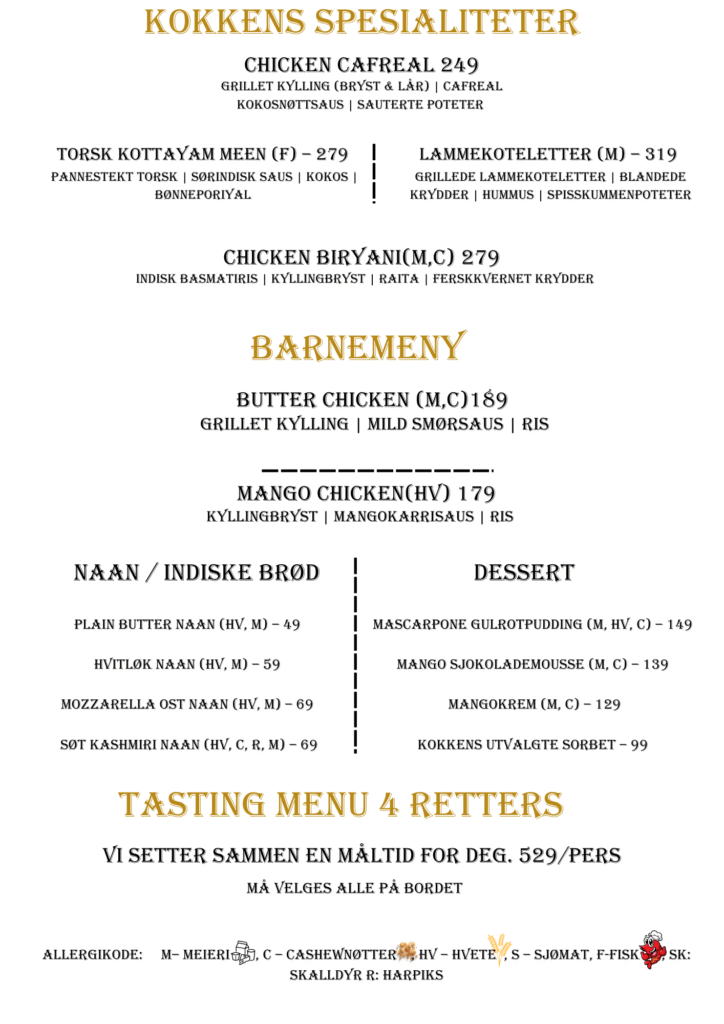 Menyen er strukturert for å guide deg gjennom et bredt spekter av Indias kulinariske kart. Fra de rike, kremete karriene fra Nord-India (Mughlai) til de sterke, aromatiske smakene fra Sør-India, har vi noe som passer enhver gane. Våre kokker bruker eldgamle oppskrifter, men presenterer dem med en moderne vri, noe som sikrer en fine dining opplevelse av ypperste klasse. Vi legger vekt på sesongens beste råvarer, som er nøye utvalgt for å gi deg den mest autentiske smaken av India her i Oslo.